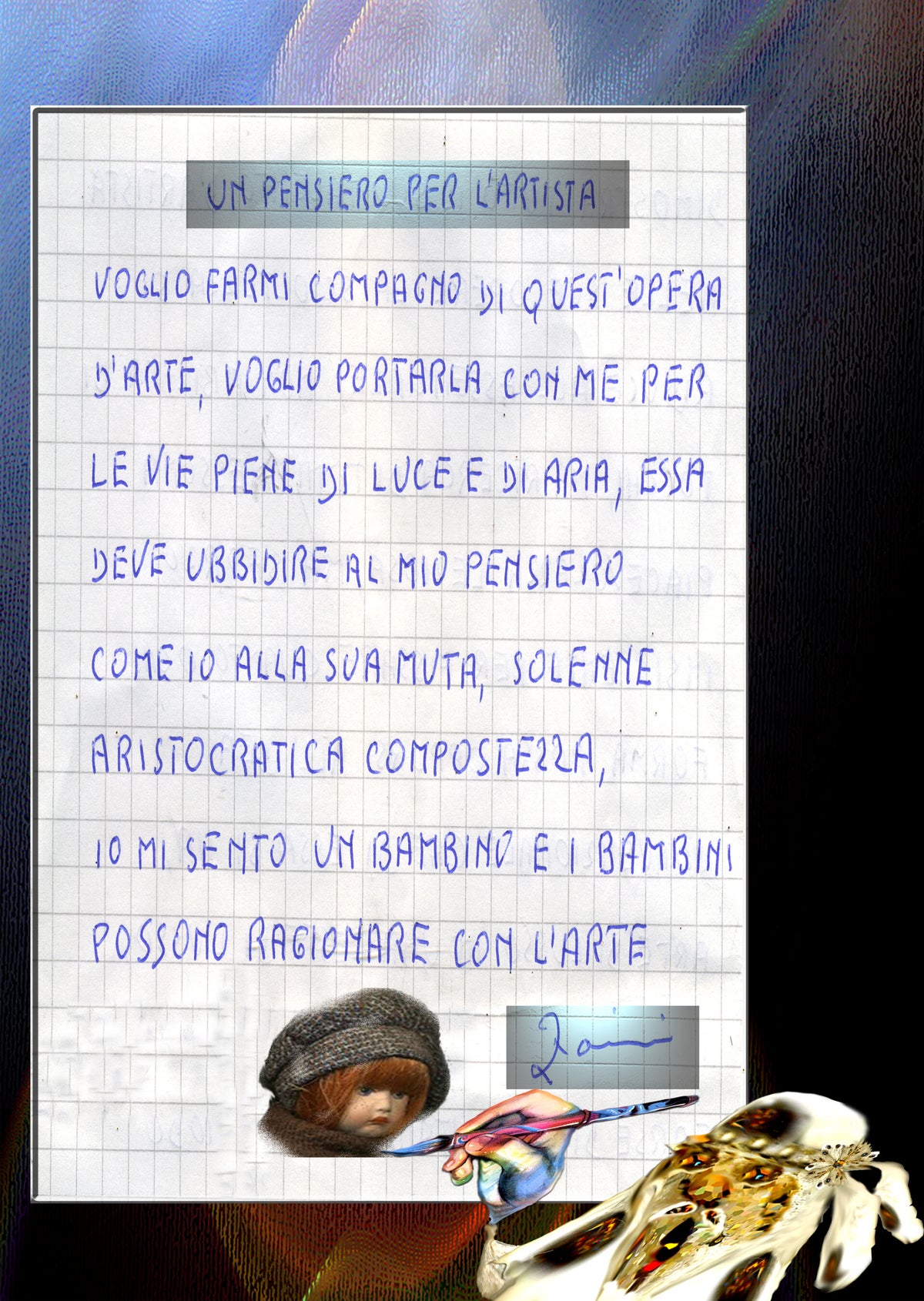 ANCORA UNA VOLTA DESIDERO CONFERMARE TRAMITE LE MIE PERSONALI COMPOSIZIONI, AVENDO USUFRUITO DI QUALCHE IMMAGINE DI " AI RIGENERATIVA" NELL'ARTE DIGITALE , OTTENENDO COSI' UN VERO CONNUBIO ARTISTICO NON SOLO DI VALORE TECNICO MA SOPRATUTTO UMANO, NOTANDO APPUNTO CHE LA MANUALITA' E CREATIVITA DELLA COSCIENZA UMANA SIA ANCORA DETERMINANTE PER L'ARTE CONTEMPORANEA ,INCORPORANDO ANCORA VALORI EMOZIONALI E CULTURA " SOCIALIZZANTE ".
