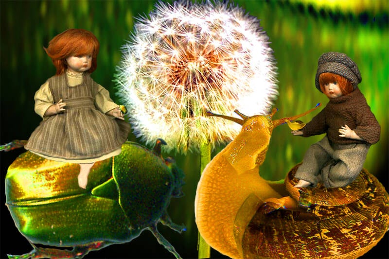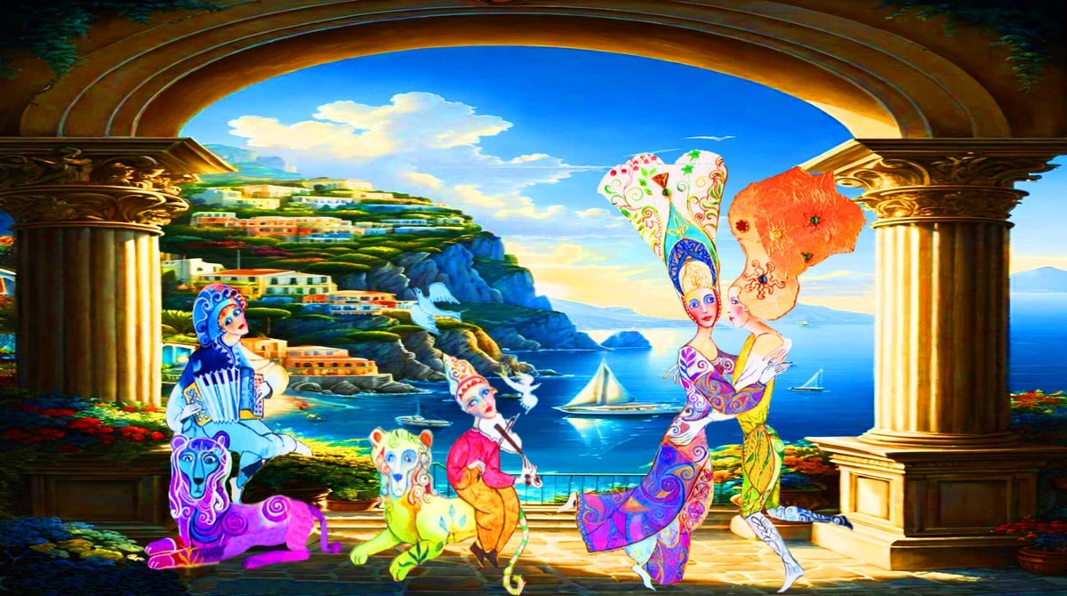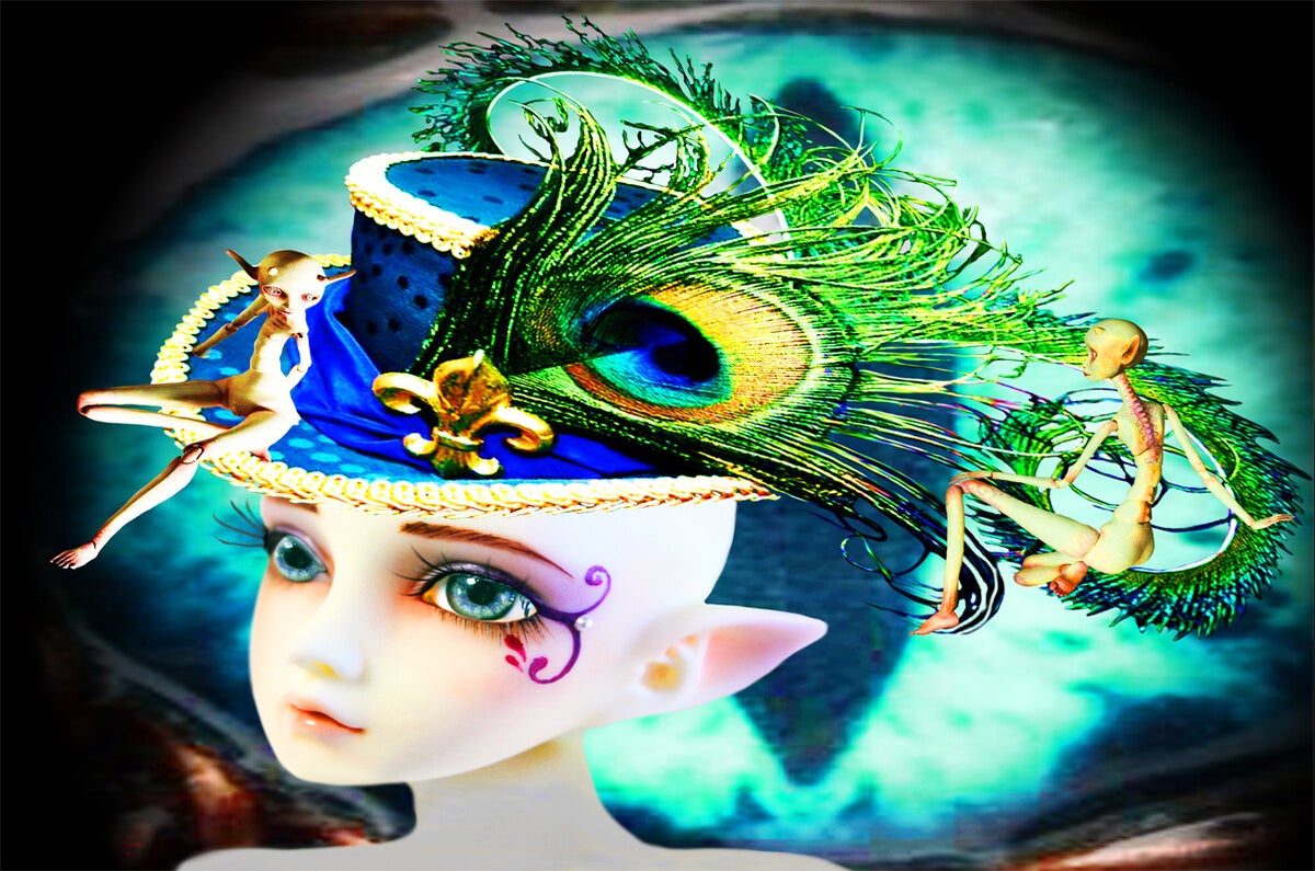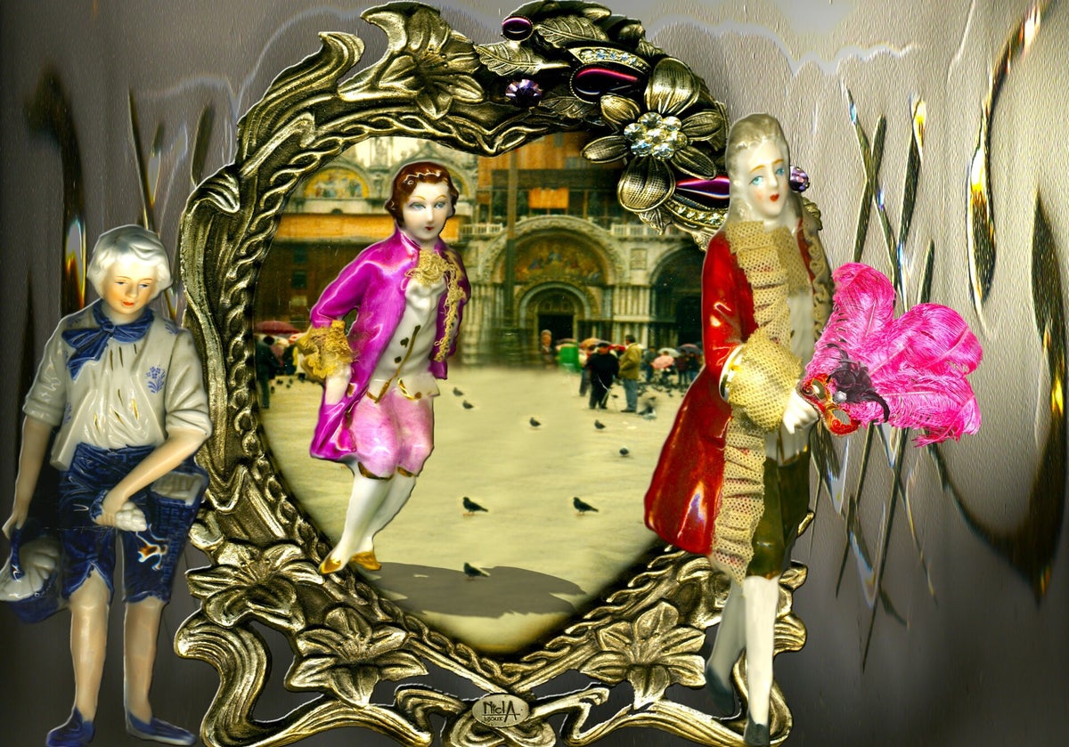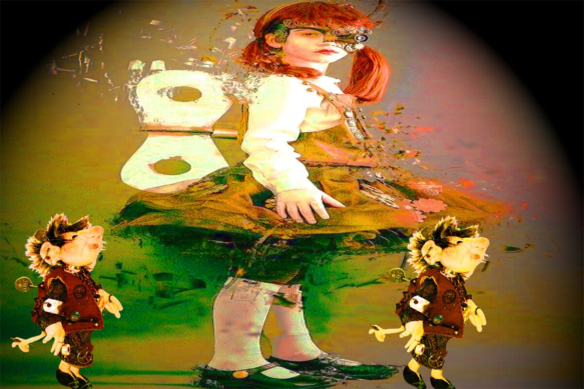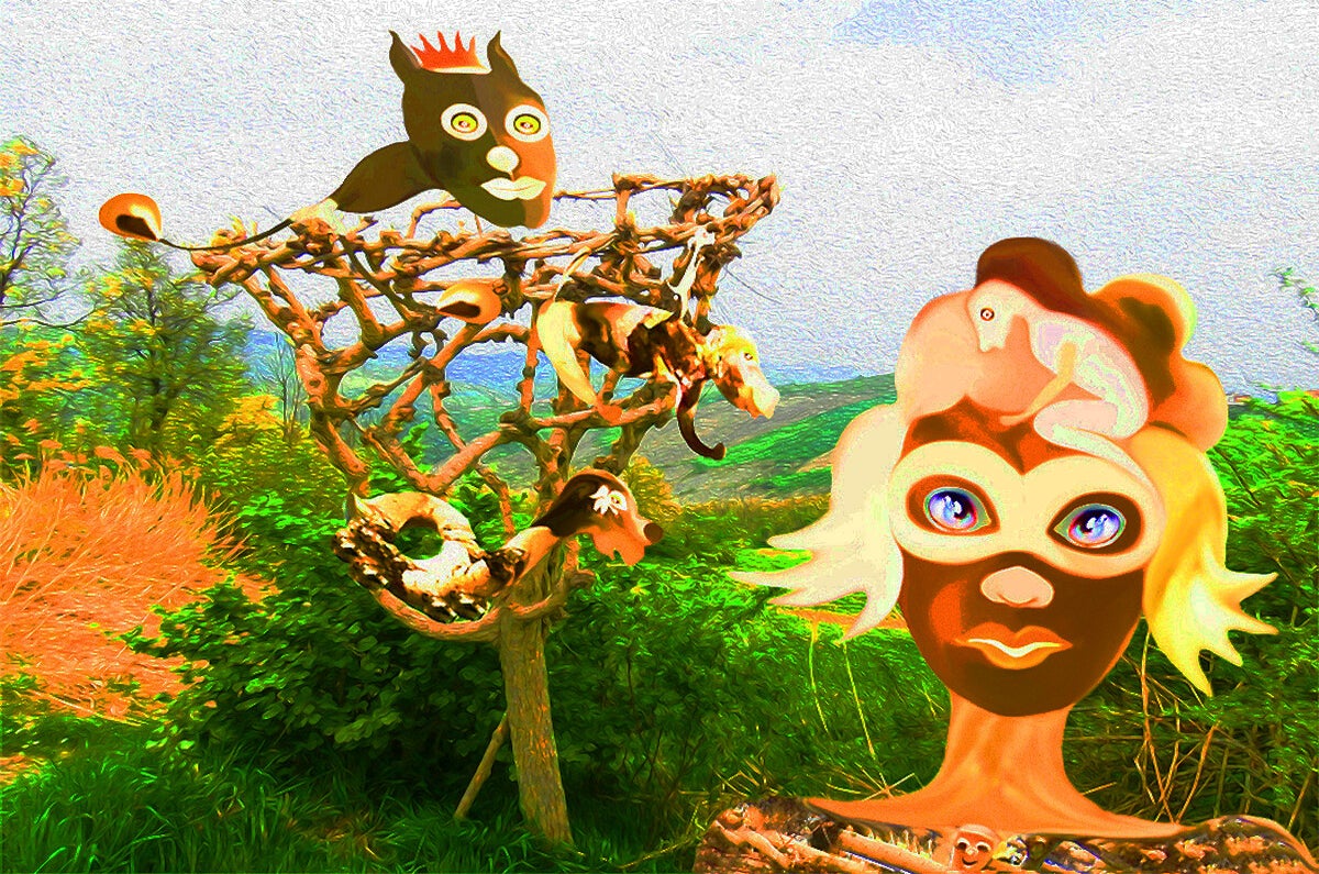 SURREALISMO FANTASY PERSONAGGI ARTISTA DIDIER DELAMONICA CON INTERVENTO MIO CON ALTRI PERSONAGGI IN UNA VISIONE CON LO SFONDO COLLAGE.