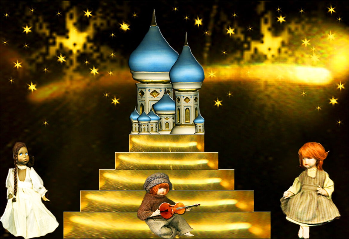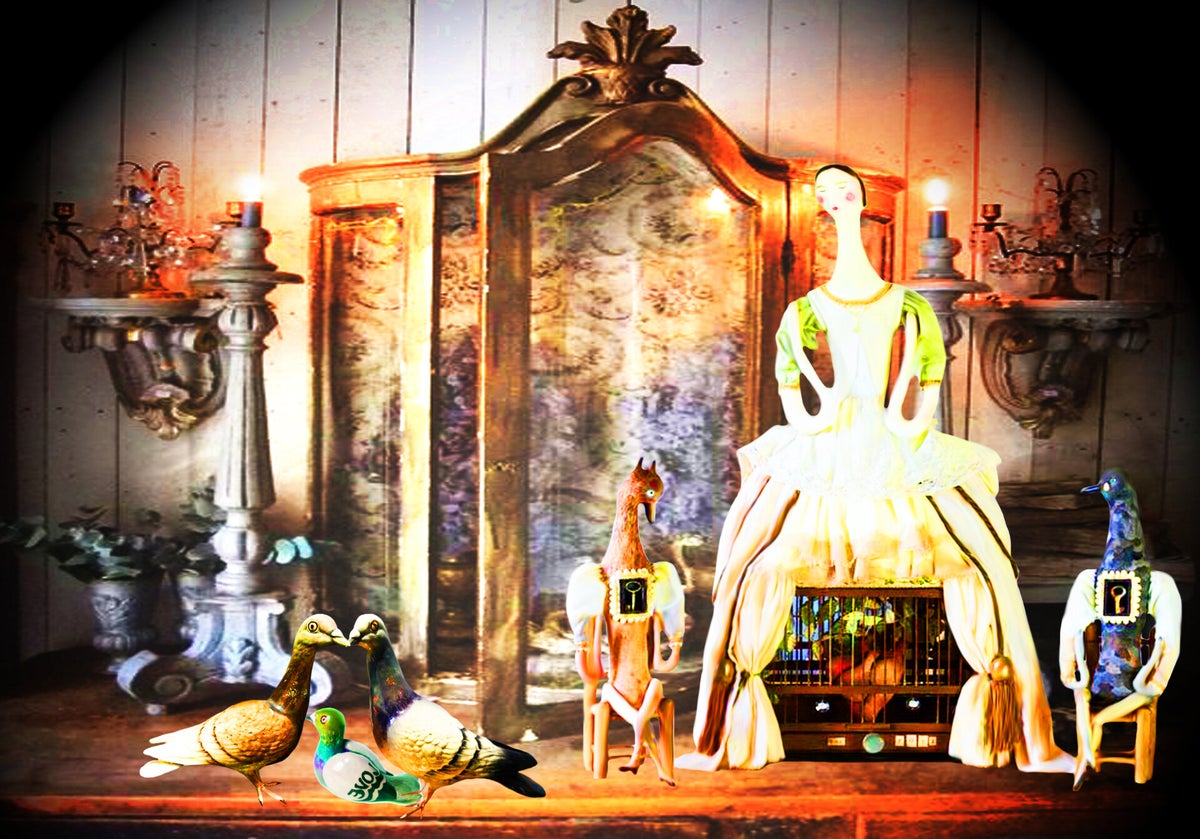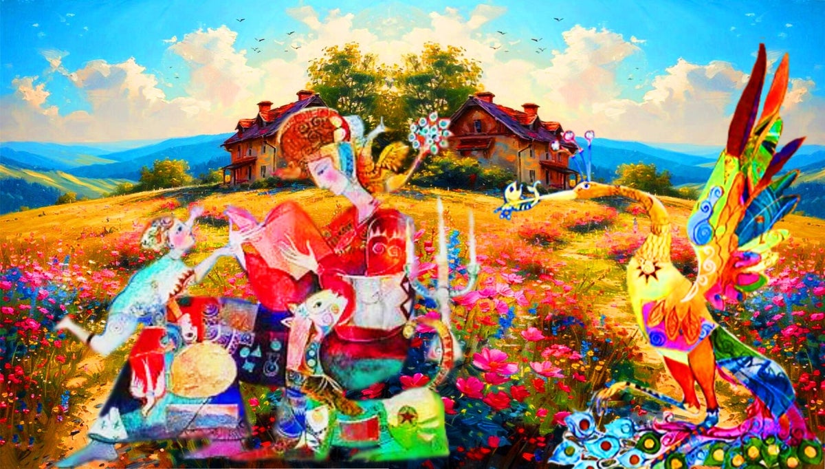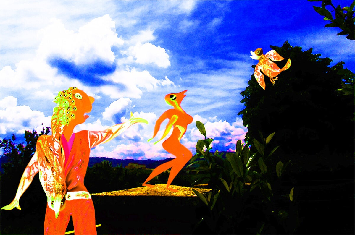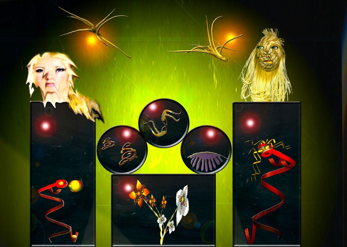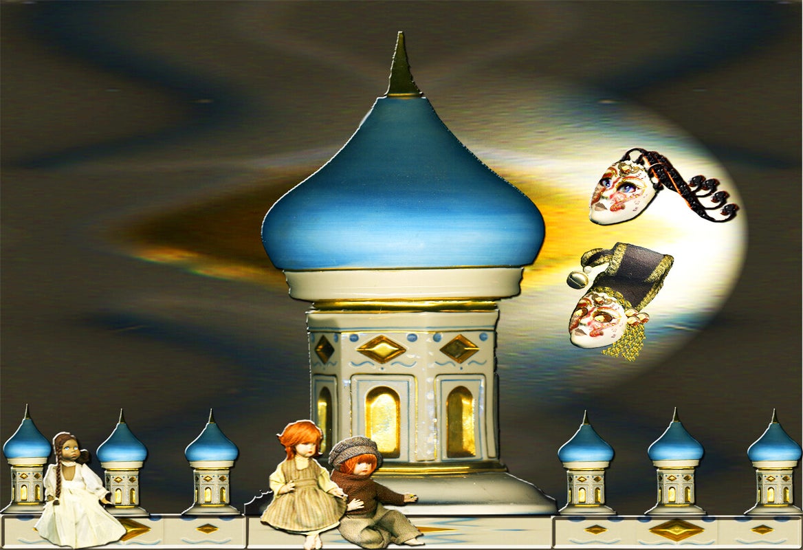 SURREALISMO FANTASY PERSONAGGI ARTISTA DIDIER DELAMONICA CON INTERVENTO MIO CON ALTRI PERSONAGGI IN UNA VISIONE CON LO SFONDO COLLAGE.
