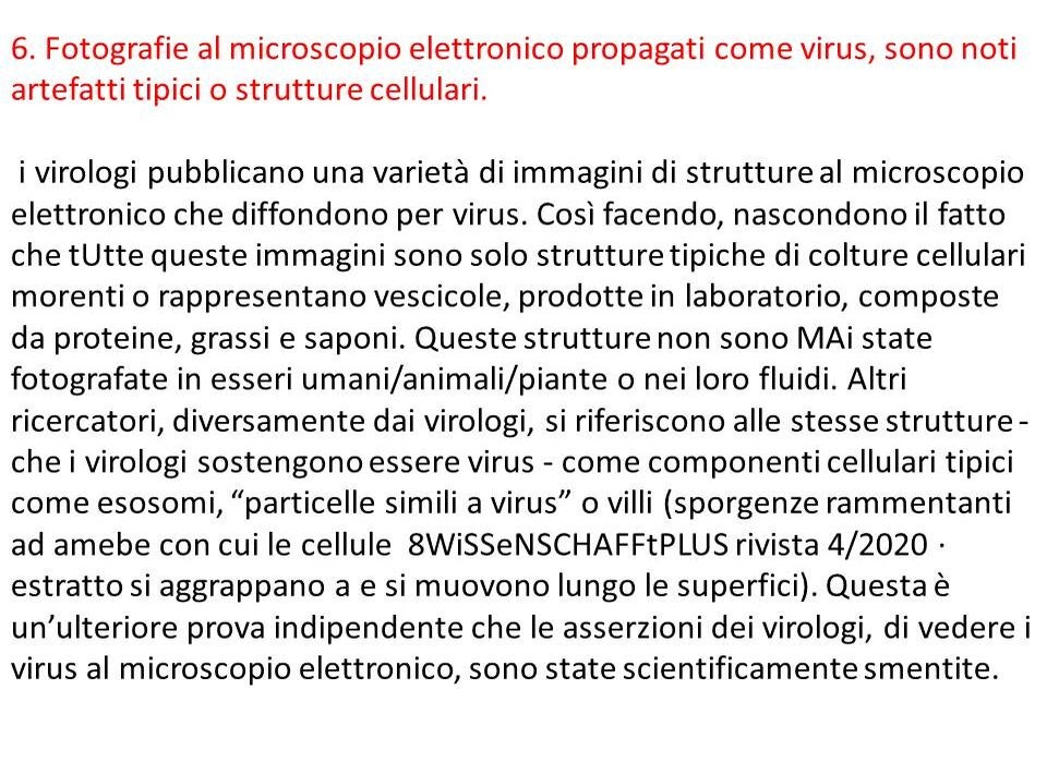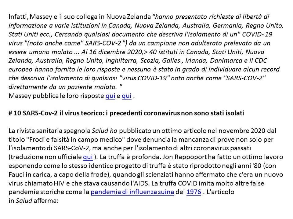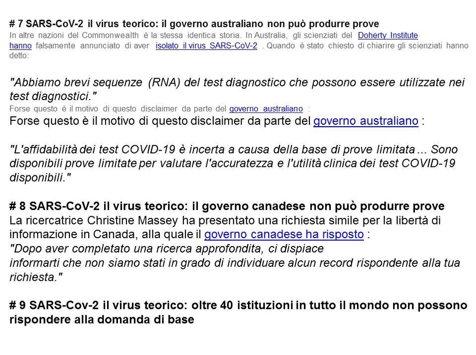 Contemporaneamente sono emerse anche le contraddizioni e le incongruenze in ambito scientifico: oltre duecento FOIA (richieste di trasparenza dei cittadini alle istituzioni) ai governi e alle autorità sanitarie in tutto il mondo hanno ottenuto come risposta che il fantomatico virus non è mai stato isolato.