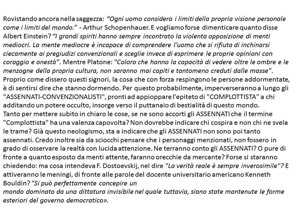 Ora, tra tutti questi personaggi occorre sicuramente distinguere, tra loro ci sono anche coloro con cui si può fare un pezzo di battaglia assieme. Quando Cacciari afferma di voler costituire un polo informativo alternativo, ben venga: vedremo poi quanto sarà veramente aperto a tutte le posizioni o, come ByoBlu e Radio Radio, faranno la selezione delle sole posizioni politicamente e scientificamente corrette!