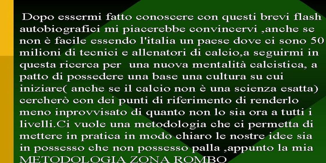 Spero di suscitare interesse non solo nei lettori, ma soprattutto negli allenatori. Mi definisco "Personal Training (leader di se stesso e dei suoi giocatori)". Voglio ridare spettacolo proponendo un calcio offensivo con schemi che si basano sulla realizzazione di rombi senza palla in passaggi finalizzanti ai giocatori con più talento. Basta con il possesso palla sterile! dove il portiere tocca più palloni in assoluto , ai miei tempi il pallone veniva trasmesso prima possibile ai giocatori con maggiore talento offensivo e doti tecniche sopraffine di velocità e che sapevano tirare in porta.