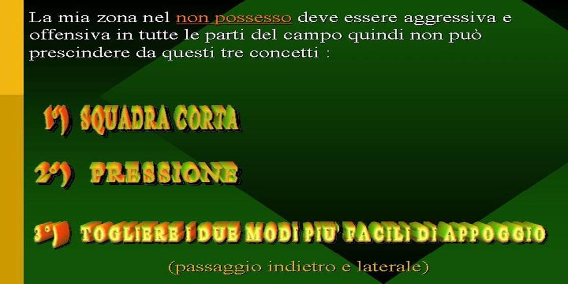 Aggiungo ulteriori nozioni su questi miei profondi convincimenti , si parte naturalmente da un mio aspetto predominante offensivo del mio calcio, cosa intendo , nella formazione di base non devono e non possono mancare cinque giocatori ,inseriti contemporaneamente , con queste caratteristiche ; due ali esterne non specificamente con il piede invertito essendo intercambiabili sx.-dx.-- due trequartisti ( mezze punte ) , con spiccate caratteristiche offensive e di finalizzazione-- una punta centrale molto propensa a fare pressione allo stesso tempo incontro nella costruzione centrale dello schema proposto e anche opportunista--- si aggiunge naturalmente un centrale metodista , con il compito di raccordo fra tutti i reparti e negli ultimi 16 mt. difensivi inserirsi come centrale di difesa, rimangono due difensori esterni non fluidificanti e due centrali si ottiene così in fase statica un 4-3-2-1 e in fase dinamica 4-1-4-1 e negli ultimi 16 mt. difensivi un 5-4-1;